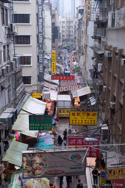 En pénétrant davantage dans Central, on finit par tomber sur le fameux tapis roulant en discontinuité sur deux kilomètres. Encore un endroit qui forme un niveau en lui-même. La rue est plus bas et suit le même trajet. La passerelle du tapis roulant est à la hauteur des étages des immeubles tout proches. Je scrute pour apercevoir une Maggie Cheung de In the mood for love, un intérieur de The killer… En fait, ce sont principalement des magasins qui font ainsi leur publicité. Les gens vont et viennent dans tous les sens. La faune est très internationale et j’adore ça! On peut entendre toutes les langues – dont du français car la plus grosse communauté en Asie se trouverait à Hong Kong. L’anglais passe presque systématiquement. Très vite, on remarque les chinois nés au contact des anglophones – ils ont un anglais magnifique – et ceux ayant grandis uniquement au contact du chinois et dont l’anglais est beaucoup plus difficile à comprendre. La veille, lors de l’achat de l’adaptateur pour mon ordinateur, l’homme a dû répéter quatre fois three hundred avant que Christelle me le décode. Il m’était impossible de comprendre le three.