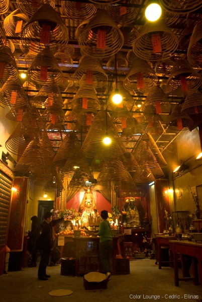 La très très grosse mauvaise surprise, le choc même, nous attend à la sortie: la pluie. Nous sommes écœurés. Une pluie qui va durer plusieurs heures et qui va nous empêcher de nous promener comme nous le voudrions, m’empêcher de prendre des photos et ralentir notre progression. Nous allons tout de même jusqu’au temple Man Mo à l’ouest, dans Hollywood road. Composé de trois parties (une peut être visitée), il est encerclé de gratte-ciel ce qui rend la vue étonnante. Construction coloniale du XIXe siècle, il est dédié à Mo Tai (dieu de la guerre) ainsi qu’ à Man Cheong. Il est vivant et très actif. Les murs sont décorés de petites statues ou de ce qui semble être des plaques votives. La pluie ne se calme pas. Nous n’avons pas d’autre choix que de nous abriter dans un café. Le premier sur lequel nous tombons est assez classieux, il est tenu par un Français et s’appelle Duo. Le chocolat chaud l’Africain est excellent. Nous attendons. D’autres clients français viennent…