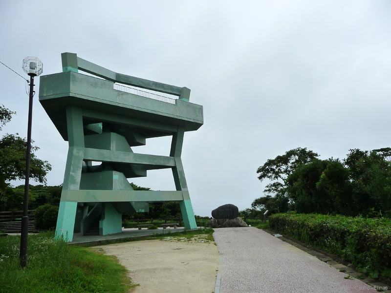 Au nord-ouest, de l’autre côté de la baie, se trouve Shikanoshima (satellite) à laquelle on accède via un isthme. Entre un passage de la largeur de la route et deux ponts assez grands, la balade est très sympa. L’île doit s’étendre sur trois kilomètres de long et une petite route en fait le tour. Le vent d’est donne de rouleaux qui blanchissent sur les plages de sable fin. L’ambiance « vacances » est passée au niveau supérieur d’un seul coup. Voyant des rochers grimpables, je décide d’arrêter la voiture pour aller faire le singe. Les rochers sont mes branches. Je me souviens de mes longues courses en Bretagne, sur la Côte sauvage, à courir, sauter et escalader les blocs de pierre de long en large. Mes vagues souvenirs de deux années d’escalade me reviennent plus ou moins. Au sommet, perché, je suis heureux. Noriko est restée sur le bord de la route, peu intéressée ni équipée des chaussures adéquates. Par moment, la nature sculpte de drôles de formes. Un peu plus loin, j’ai l’impression de voir comme une alcôve où je souhaite aller faire l’idiot pour m’y réfugier. Impossible de descendre! Pas d’escalier pour y accéder. Je reconnais bien là le Japon. Si mes souvenirs sont bons, chaque centimètres de côte est accessible en France, pourquoi ici, on ne peut pas sortir du chemin tout tracé? Frustrations! Au nord est de l’île, Noriko aperçoit une pancarte qui indique une route vers un parc et un panorama. Nous slalomons sur une route étroite de lacets avec les branches des arbres qui lèchent le toit de la voiture La montée est raide. Sur le sommet, est posé un observatoire – à l’architecture jurant avec l’environnement – même s’il est vert (sic) – en haut duquel des amoureux transis attachent des cadenas gravés d’un message qu’ils fixent sur la balustrade. Le geste est mignon alors que la construction ne l’est pas. Le vent nous décorne mais la vue est belle.