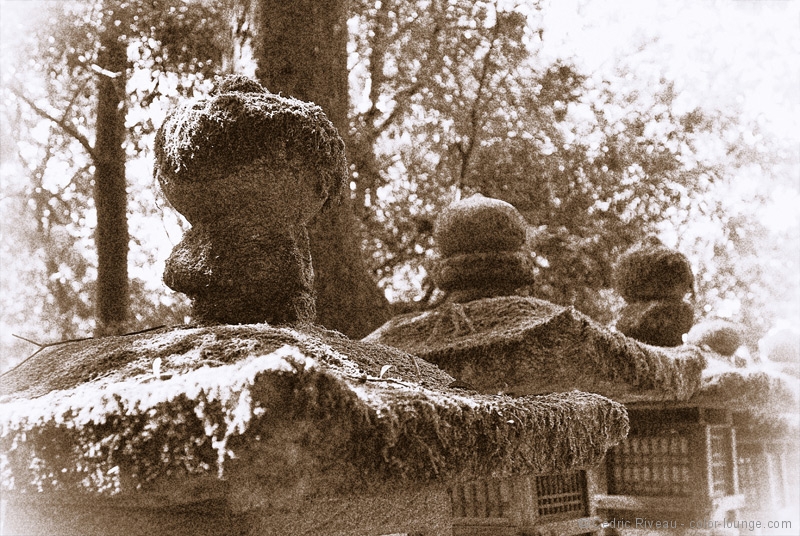 Il s’agit en fait de plusieurs filtres superposés en calques les uns sur autres avec soit une saturation des couleurs avant un délavage pour la patine et du « bruit » avec vignetage pour finaliser les photos couleurs, soit une monochronie avec les photos de détails qui suit à peut près le même processus.
