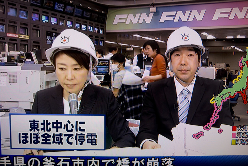 Quand Thomas et moi sommes sortis pour retrouver Noriko avec qui j’arrivais à avoir des mails épisodiques via son téléphone, nous avons découvert un Tokyo comme nous ne l’avions jamais vu : des embouteillages à des endroits inhabituels bien sûr mais surtout, des gens partout… des milliers de gens marchant dans les rues pour rentrer chez eux ou du moins se diriger vers leur habitation. Parmi eux, des gens avec des casques de sécurité, des casques qu’on trouve dans tous les tiroirs de bureaux dans toutes les entreprises du pays. Très impressionnant. Quand il pleut, les magasins se frottent les mains car ils multiplient leur vente de parapluies qu’on trouve pour pas grand chose ici. Hier soir, ce sont les vendeurs de vélo qui se frottaient les mains. Comme les supérettes et les restaurants, ils ont été pris d’assaut permettant à certains de rentrer chez eux.