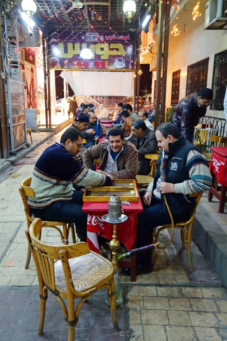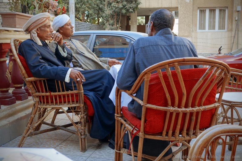 Je souhaite donc me rabattre sur des pâtisseries afin de faire passer ma déception. Hussein me conseille un endroit dans le centre ville et nous y passons avant de nous rendre dans un café local et très fréquenté : le café Al Andalib, du surnom d’un ancien chanteur très connu : Abdel Halim Hafez. Je peux y manger mes gâteaux et boire plusieurs thés à la menthe pendant que des gens en djellaba, en costume ou en tenue décontractée boivent la même chose, équipés bien évidemment d’un narguilé. Nous discutons de tout et de rien comme la vie dans le pays, le séisme du 11 mars 2011 au Japon, du nucléaire, du terrorisme. Il me parle aussi de son travail de guide touristique et ses évocations de nuits dans le désert blanc me donnent très sérieusement envie de revenir !