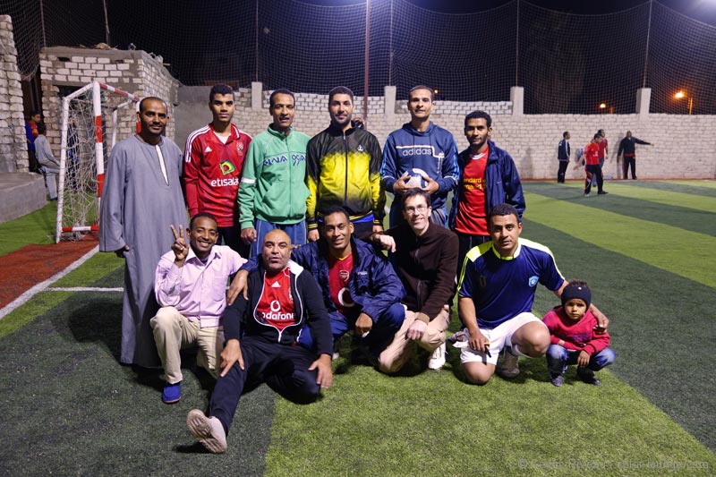 Je repasse à l’hôtel. Mohamed et Hussein reviennent me chercher vers 17h30. Ils ont prévu de m’emmener les voir jouer au foot avec leurs amis. Sauf qu’il manque une personne et à 18 heures, quand ils commencent à jouer, tous me demandent de les rejoindre pour participer… Je joue au foot en Egypte ! Moi ! Trop fort ! Heureusement que je fais du vélo au quotidien mais tout de même, ce n’est plus de mon âge et je tire la langue rapidement ! J’essaie bien de marquer quelques points mais avec mes pieds d’handicapé du ballon, je tire toujours à côté si bien qu’ils ne me passent plus la balle. Je demande au gardien de me remplacer au bout d’un moment car je n’en peux plus et ils jouent trop sérieusement pour moi. Il n’empêche, je passe un excellent moment et je me sens moins comme un touriste !