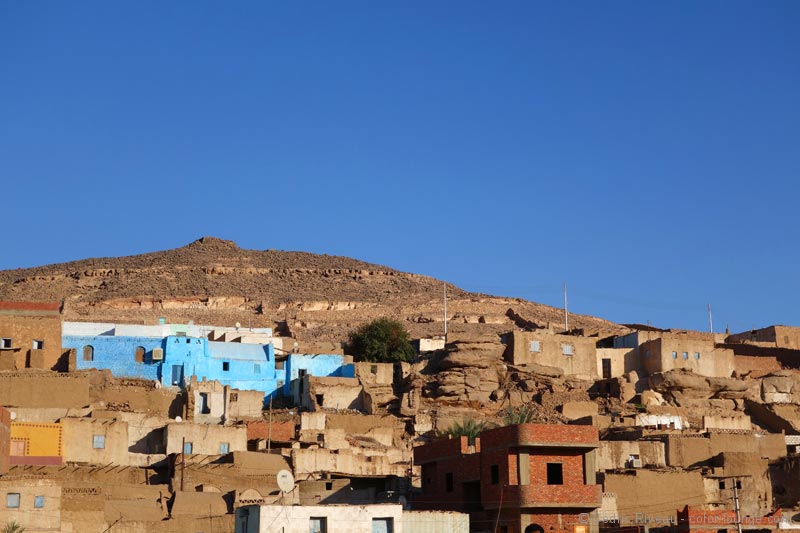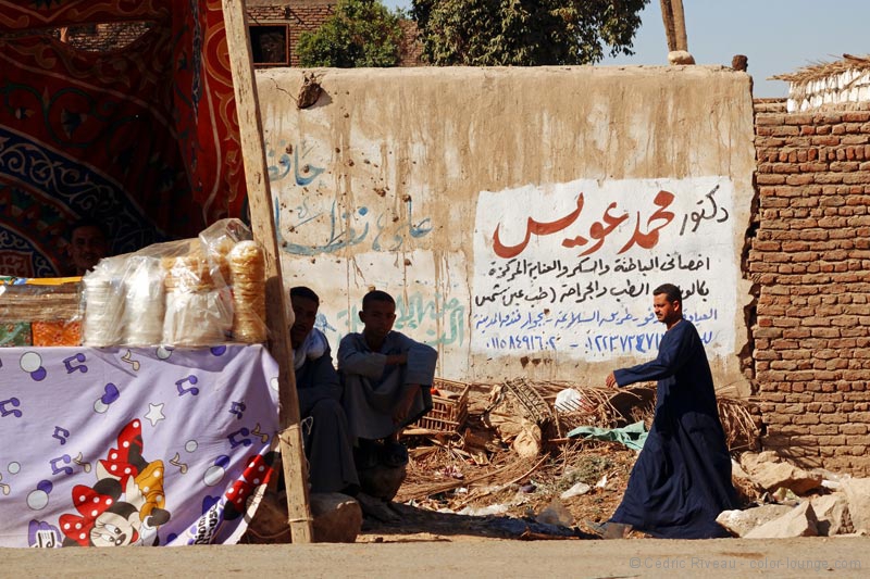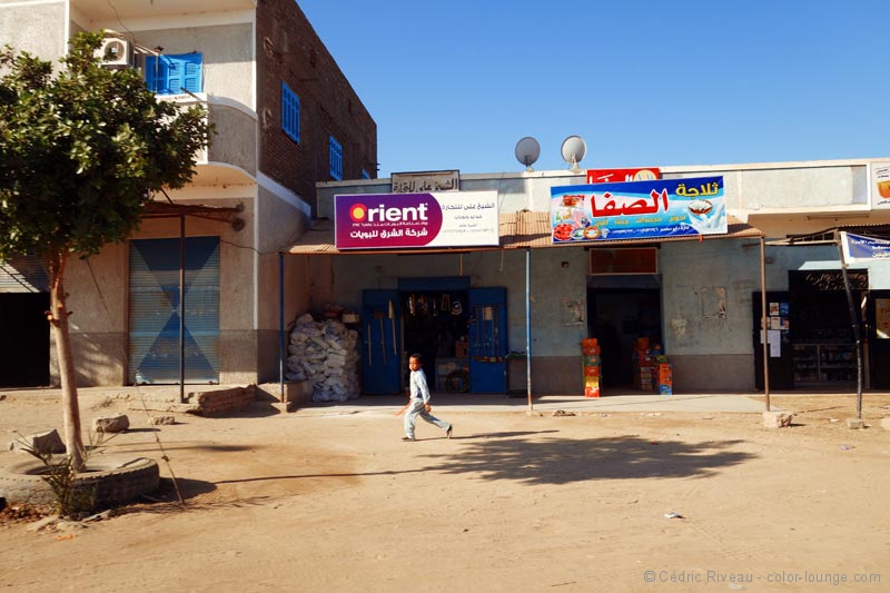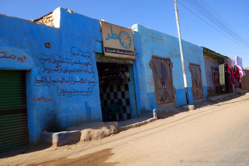 Plus nous descendons vers le sud, plus les maisons m’attirent. Beaucoup sont peintes, notamment en bleu. Nous pénétrons en Nubie m’explique Hussein. Une Nubie relative puisque ces maisons ont été déplacées ici suite à la construction du barrage d’Assouan, la fierté de Nasser et financé par les Soviétiques. Rien de moins que 60.000 personnes ont été relogées, sans parler des temples antiques qui ont dû être élevés car menacés eux-aussi par la montée des eaux. Quand l’homme va contre la nature…