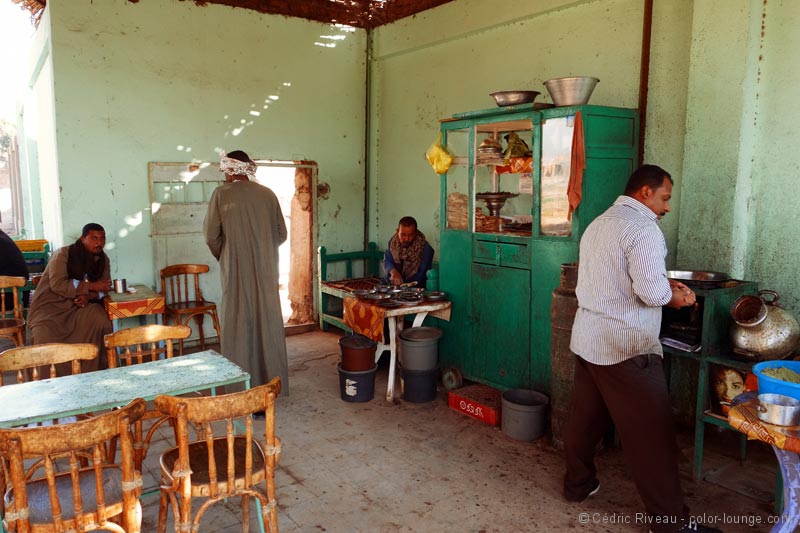 Nous arrivons à Edfou après 10 heures et c’est l’heure du falafel – autrement dit du petit déjeuner – pour les Égyptiens. Hussein m’explique qu’ils ne boivent qu’un café ou un thé au réveil et mangent vers 10h. Nous nous installons dans un café (?) juste en face de l’entrée du temple et apparemment, ils connaissent parfaitement l’endroit. Je me contente d’un thé.