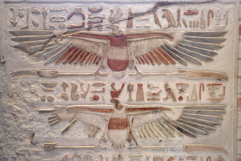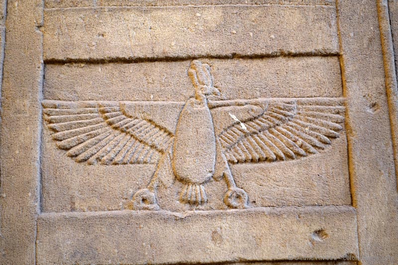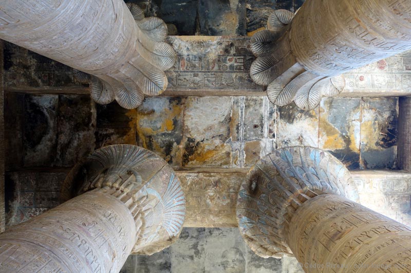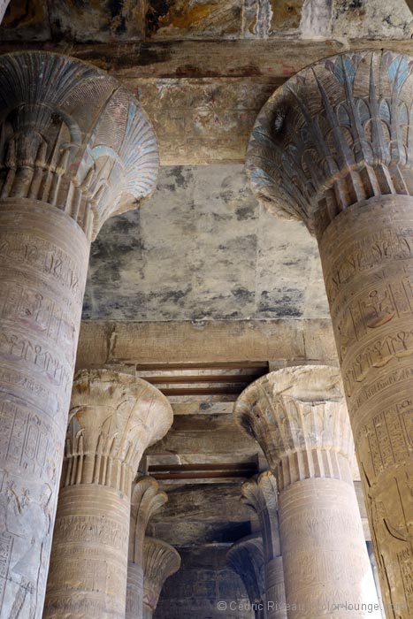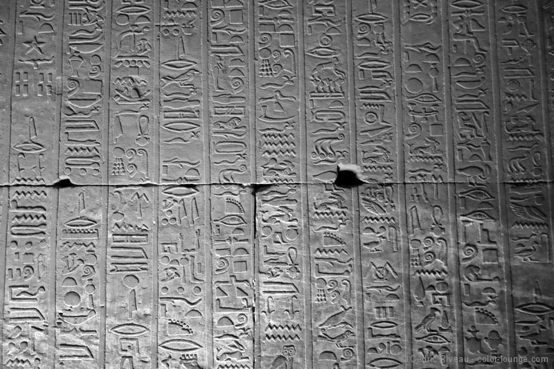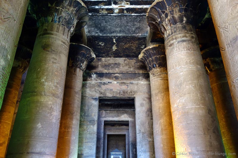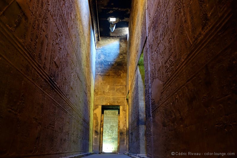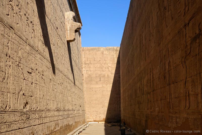 Je découvre un temple plus moderne que ce que j’ai vu jusqu’à présent et je note aussitôt la différence de style des bas-reliefs et hiéroglyphes. Plus travaillés, je les aime moins même si le lieu est impressionnant. Dédié à Horus, il contient plusieurs statues du dieu à tête de faucon et surtout la plus grande au monde en granit, clou de la grande cour. Elle est très impressionnante. Le passage entre les enceintes est la partie la plus intéressante. De nombreux passages et escaliers à l’intérieur des murs témoignent d’une architecture plus élaborée. Dans la salle hypostyle, les quatre chambres aux offrandes avec chacune une fonction différente sont passionnantes. En ce qui me concerne, je m’exalte pour celle des parfums. Tout d’abord pour mon rapport aux essences mais ici, dans cette salle même, mon intérêt pour l’Égypte prend une tout autre dimension. Hussein me fait d’abord remarquer qu’il n’y a que des hiéroglyphes et pas de bas-reliefs de pharaons ou de rois. Nous sommes donc en présence de textes que je ne peux malheureusement pas lire. Hussein oui. Sur ces murs sombres sont écrits des quantités, des ingrédients, des durées… j’ai devant moi des recettes pour fabriquer des parfums ! Des recettes de plus de 2000 ans comme ça, sous mes yeux. Je suis émerveillé. Véritable héritage olfactif d’une façon de préparer plusieurs fois millénaire.