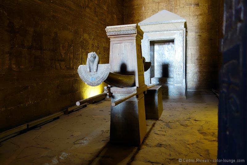 Dans le sanctuaire, la barque d’Horus reconstituée par Mariette selon les proportions des bas-reliefs du temple et d’autres dans le pays constitue le centre d’intérêt du temple du dieu. Ceux qui le visitent en 10 minutes passent obligatoirement par là. D’ailleurs, quand je la découvre, Hussein me propose de repasser plus tard, quand ils seront partis, comme il me l’a déjà annoncé avant d’entrer. Nous terminerons par cette barque et je serai complètement seul à ce moment-là ! Le travail de Mariette est tout à fait intéressant car il donne une idée de ce qui était utilisé pendant les fêtes.