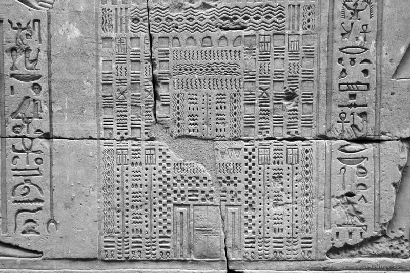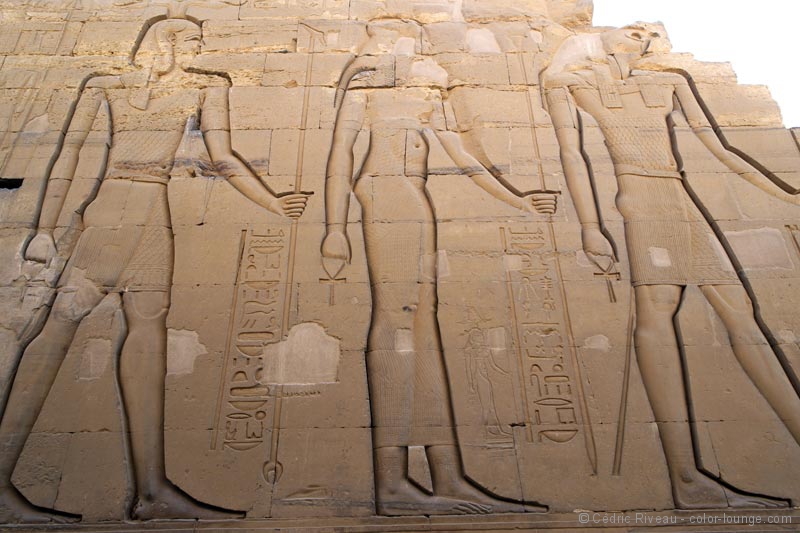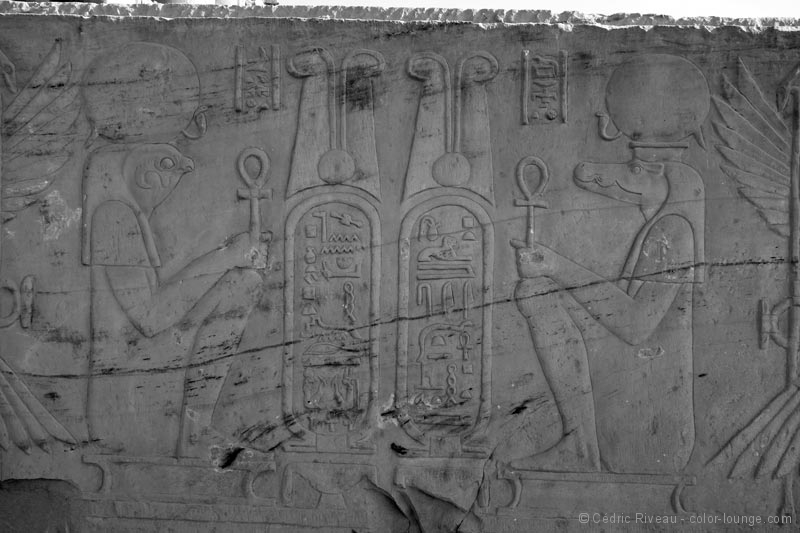 Un des clous de l’endroit est ce bas-relief d’accouchement. On y voit une femme assise et son bébé, tête en bas qui sort entre ses jambes. À l’époque donc, les femmes se mettaient assises pour accoucher ! Tout comme celui d’Horus, il renferme plein d’histoires et de récits qui ont permis aux historiens de comprendre comment se déroulaient les rites. Je commence cependant à pester contre les coptes qui ont occupé tous ces temples au début de la Chrétienté et qui ont quasiment détruit systématiquement les représentations humaines des divinités. On peut toujours cracher sur les fanatiques islamistes qui détruisent les sanctuaires au XXIe siècle, la Chrétienté n’en a pas moins à se reprocher, là-dessus aussi ! Le nilomètre est très impressionnant. Si à l’époque on ne construisait pas de barrages démesurés, on anticipait les crues du fleuve, le calendrier avec ce puits qui donnait une idée du niveau de l’eau.