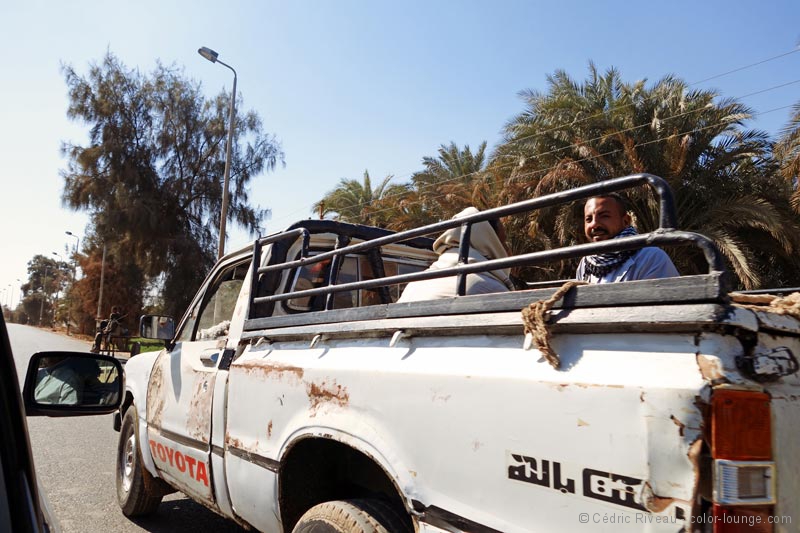 De retour sur la route, un peu plus réveillé, je redécouvre le paysage : des champs assez grands parsemés de palmiers à droite, côté Nil et le désert complet de l’autre côté de la route. Un contraste étonnant de deux couleurs voisines, de vastes étendues d’un vert dense sur les flancs du fleuve et des collines de poussières jaunes qui marquent le début du désert. Je comprends encore plus l’importance du fleuve dans le pays. Par moment, la route s’éloigne du Nil et seul le désert nous entoure comme s’il avait effacé tout le reste.