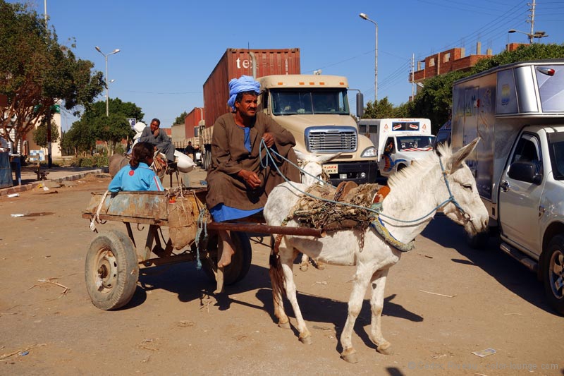 Je découvre la campagne égyptienne avec ses maisons de plain-pied, ses arrêts de bus, ses points d’eau, ses magasins modestes, ses cafés, ses passages à niveau, ses contrôles routiers et ses très très nombreux dos d’ânes – plus efficace que les radars si on me demande mon avis.